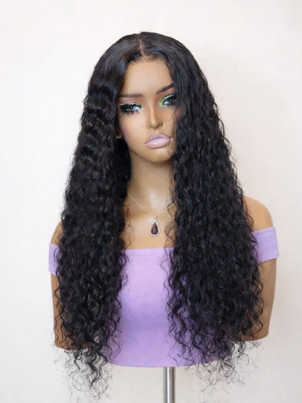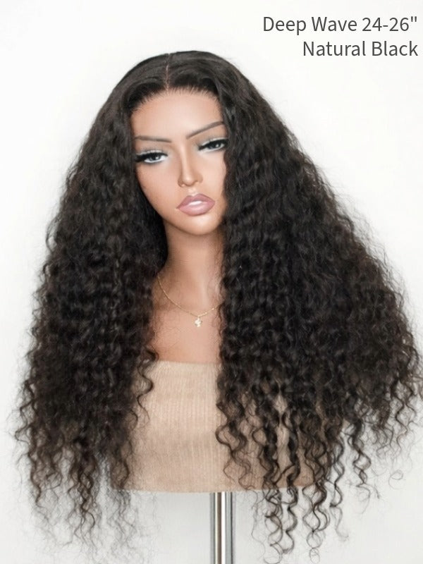 Discover effortless, natural beauty. Shop our Jet Black Deep Wave Glueless Wig (5x5 Swiss HD Lace, Invisible Knots) today!