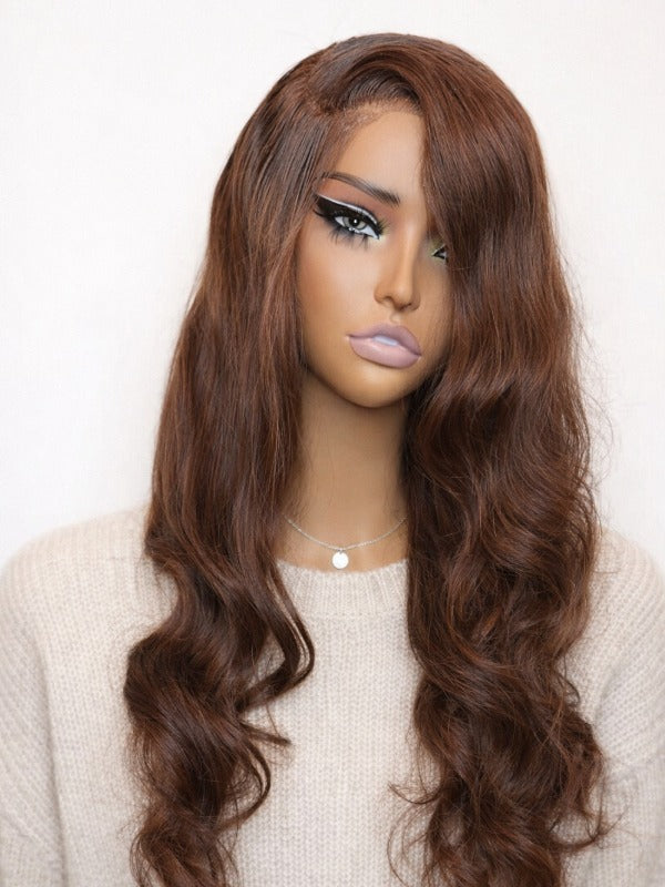 Discover effortless, natural beauty. Shop our Reddish Brown & Espresso Ready to Go Glueless Loose Body Wave Wig (5x5 Swiss HD Invisible Knots Pre-Cut Lace) today!