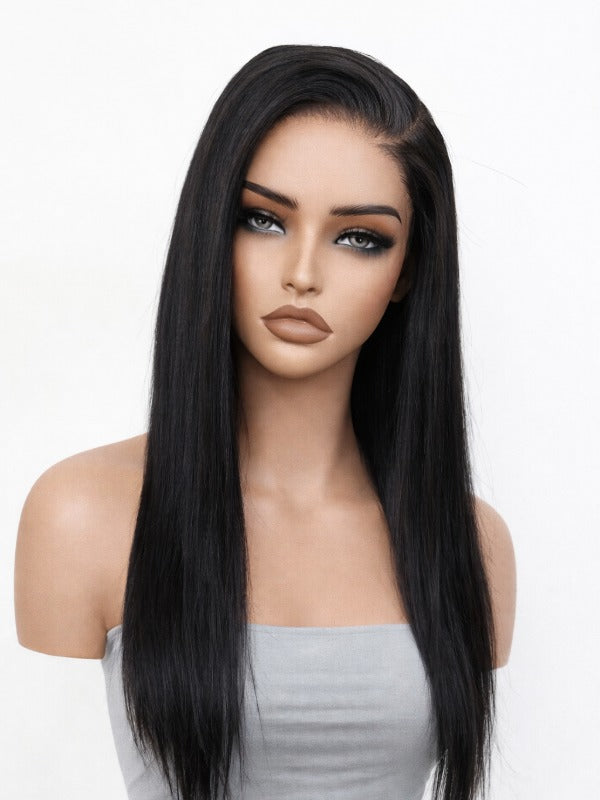 Discover effortless, natural beauty. Shop our Jet Black & Natural Black Silky Straight Glueless Wig (5x5 Swiss HD Pre-Cut Lace, 180% Density, Invisible Knots) today!
